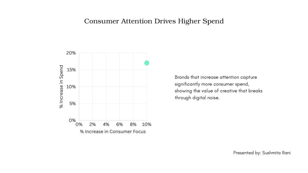 A 10% increase in consumer focus across media correlates with a 17% increase in spend; consumers who pay more attention spend roughly 2x those who give low attention. This quantifies why cutting through digital noise matters for revenue.