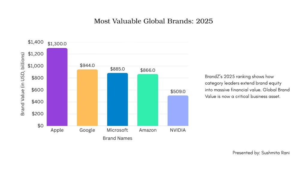 For many, branding is like a ‘soft skill’ – until someone looks at the numbers. As per the 2025 BrandZ Global Report, Apple sits at an estimated $1.3 trillion in brand value. Google follows with $944B, Microsoft at $885B, Amazon at $866B, and NVIDIA at $509B.